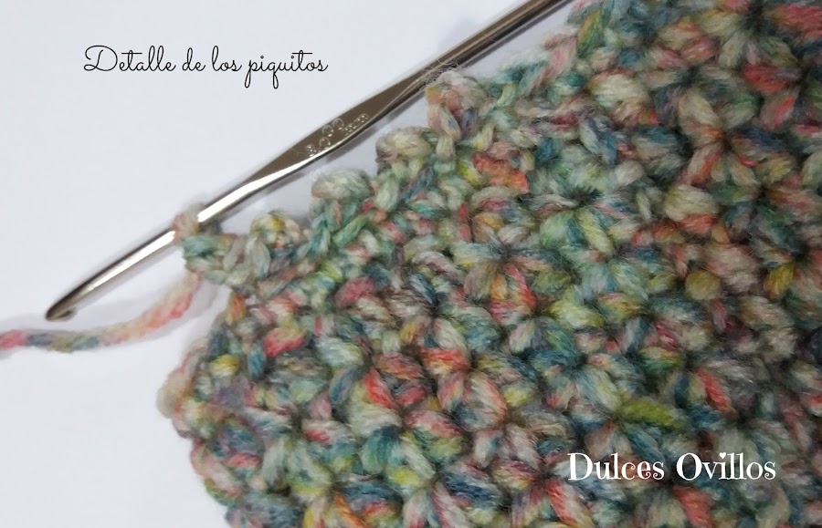 Sig. v. : *3 cad., 1 p.b. en la 3ª cad. contando desde el ganchillo (o sea la 1ª que hemos hecho), saltar 1 p.* Rep. * = 20 piquitos.