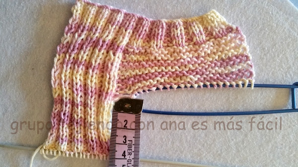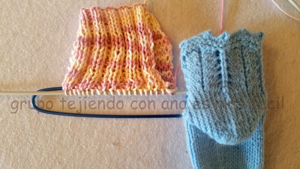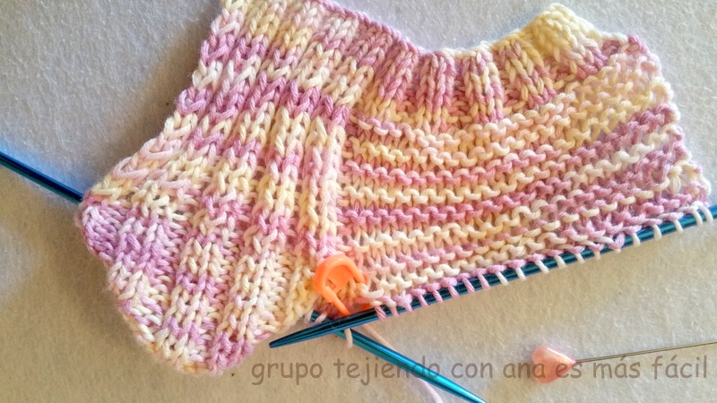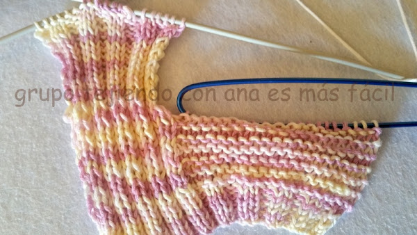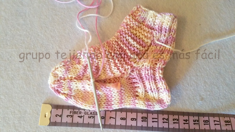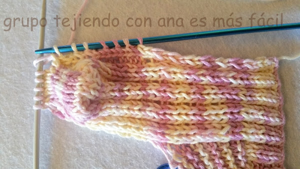 SEGUIMOS tejiendo, para formar el talón, con los 20 puntos ( 2 derecho, 2 revés) Y CAMBIAMOS A AGUJAS DEL 2 Y MEDIO, durante 4 cms,