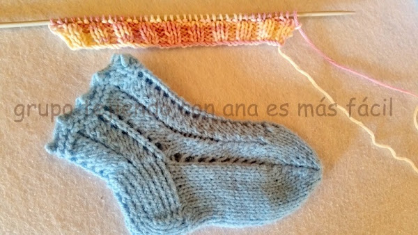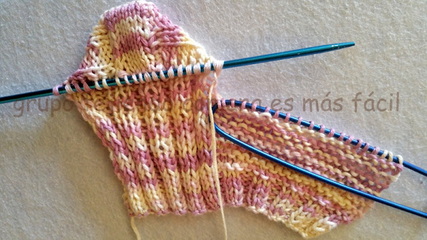 Y SEGUIMOS TEJIENDO RECTO 20 puntos de la parte del TALÓN a punto liso jersey, y 20 puntos a PUNTO SANTA CLARA O BOBO, DE LA PARTE DEL EMPEINE