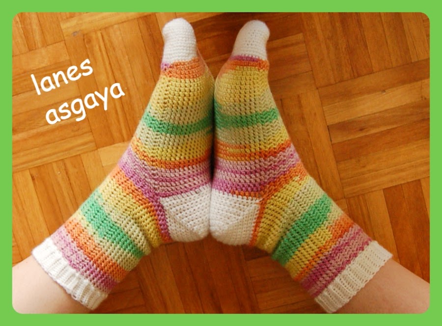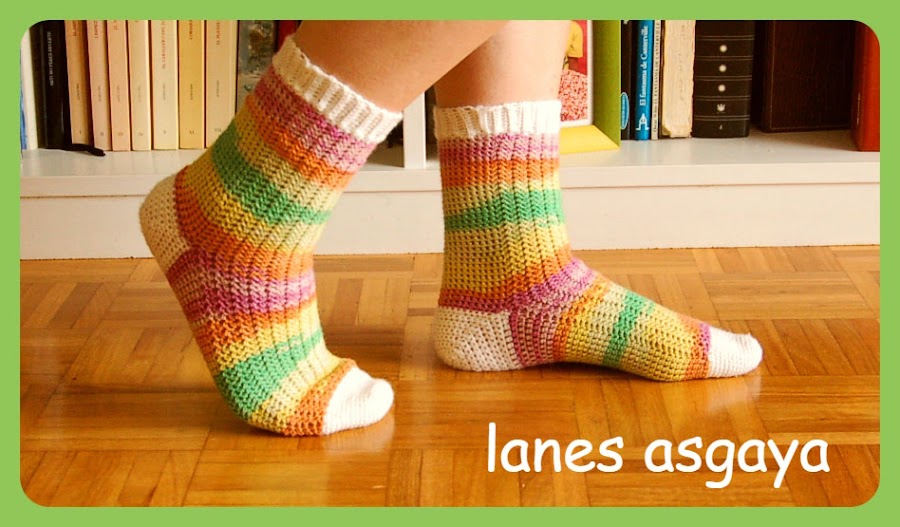 Aunque no tienen un acabado tan suave como los de punto, quedan con más cuerpo, como más duros, para entendernos. Aunque no sé si se deberá a estar tejidos a ganchillo o al tipo de hilo, no es el normal que uso para calcetines, aunque tiene el mismo grosor, pero es una mezcla de lana, algodón y poliester... No sé, tendré que hacer otros con la lana de calcetines, jajaj