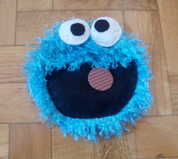 Cogemos ahora el círculo de pelo azul que va dejando pelusas por toda la casa y cosemos un dobladillo de un centímetro alrededor con puntada invisible. Unimos ahora la boca en la parte inferior del nuestro círculo azul y los ojos en la parte superior, casi dejando que sobresalgan de la tela. Cosemos también la galleta dentro de la boca de nuestro monstruo y ya tenemos la cara completa.