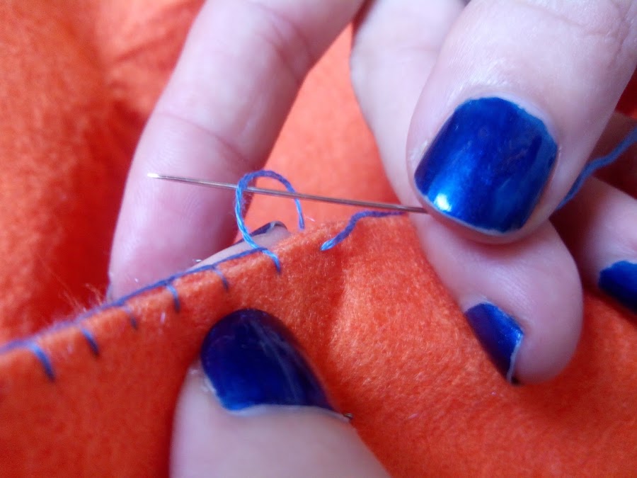 Cosemos la cara de Triki a la parte delantera del calcetín, que es la única que va decorada. Y procedemos a unir ambas partes del calcetín. Al igual que los ojos, uniremos esta parte mediante punto de festón. Clavamos la aguja desde atrás, a través del canto, y ponemos el hilo alrededor de la aguja antes de sacarla. Recordad no tensar demasiado el hilo. Os dejo un enlace nuevamente al blog de Sylvia, en el que os explica de una forma muy sencilla cómo coser los bordes y al blog de Maru de Mi Desenchufe, que ha hecho un videoblog con un paso a paso para coser un calcetín navideño.
