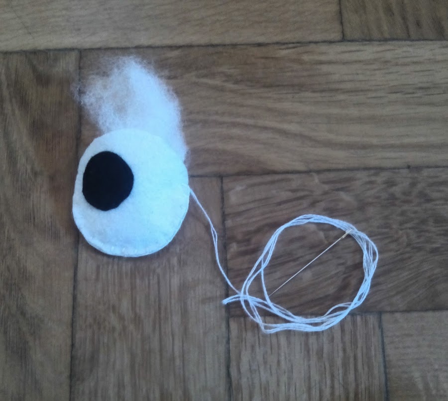 Vamos a ir siempre de la pieza más pequeña a la más grande, así que lo primero será coser los ojos, comenzando por coser los círculos pequeños negros a los blancos. Tened presente que Triki tiene los ojos “a la virulé” así que colocad los iris de forma que queden desigualados. Una vez que tenemos esta pieza hecha, cosemos los dos círculos blancos mediante punto de festón, introduciendo un poco de relleno sintético en el ojo antes de terminarlo, para darle volumen.