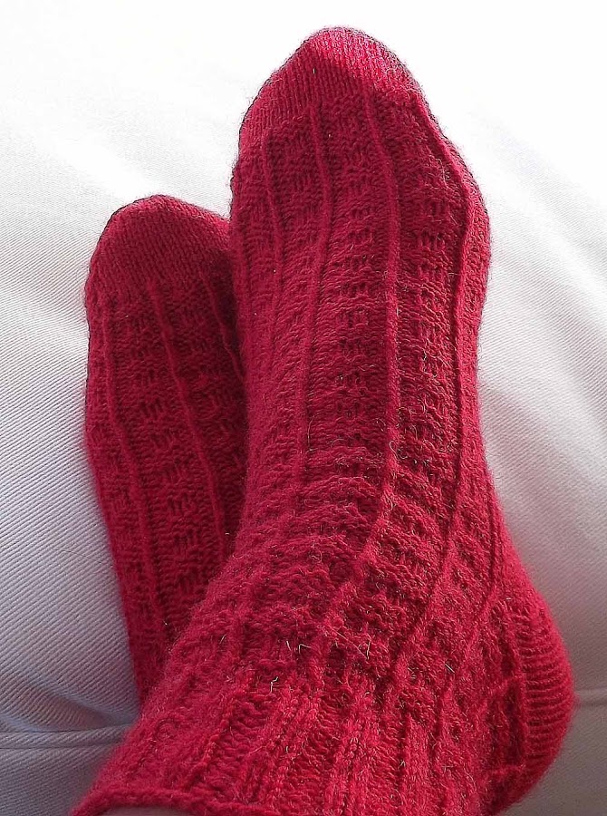 El patrón es una mezcla, usé las instrucciones de mis primeros calcetines con el motivo de un patrón de Tejemanejes, en lugar de cambiar cada dos vueltas lo hice cada tres y las punteras las tejí en punto liso.
