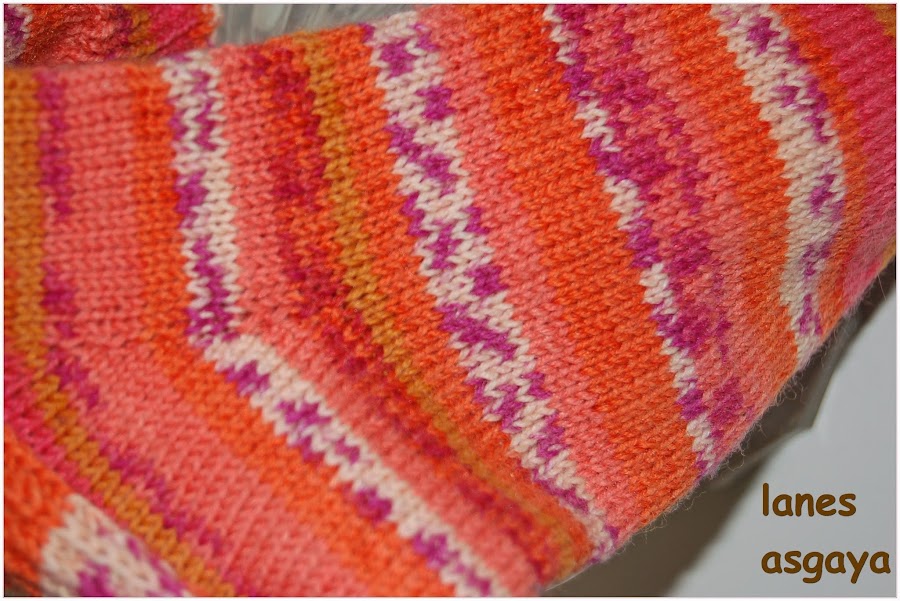 Encontré un blog el taller de concha, donde lo explica perfectamente (¡y en español, yupi...!), así que ya no hay excusa para no probar esta técnica. Se empieza a montar los puntos con el sistema de Judy Becker, con las agujas circulares. En Youtube encontré este vídeo que lo explica en español. Y después yo lo trabajé todo en punto liso (todas las vueltas del derecho, puesto que trabajamos con agujas circulares), excepto el talón, porque me apetecía ver el dibujo que hacía esta lana. Si le metía punto elástico como en las instrucciones, me parecía que no iba a lucir tanto el dibujo.