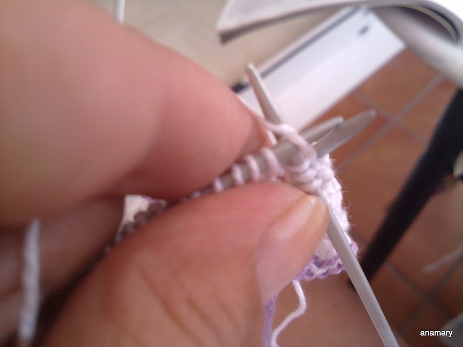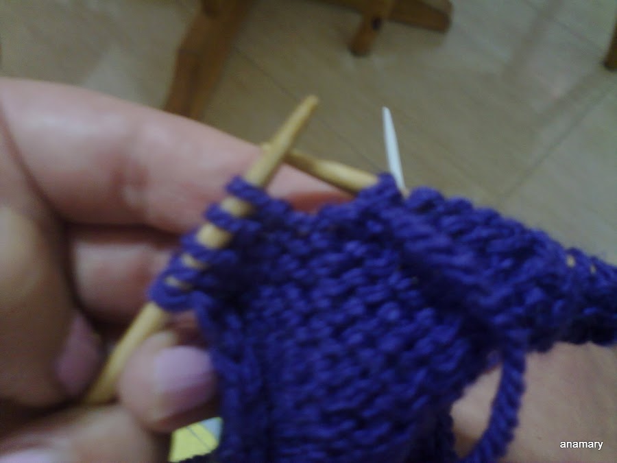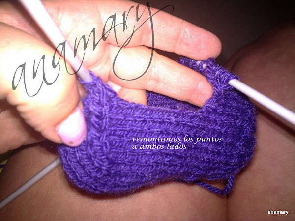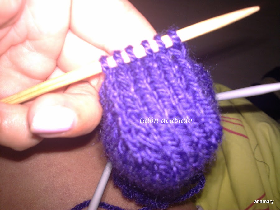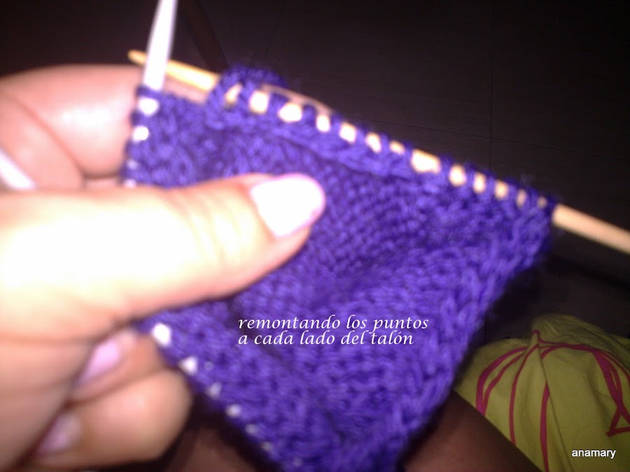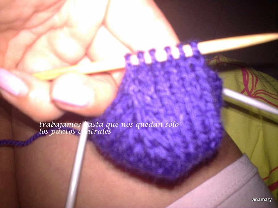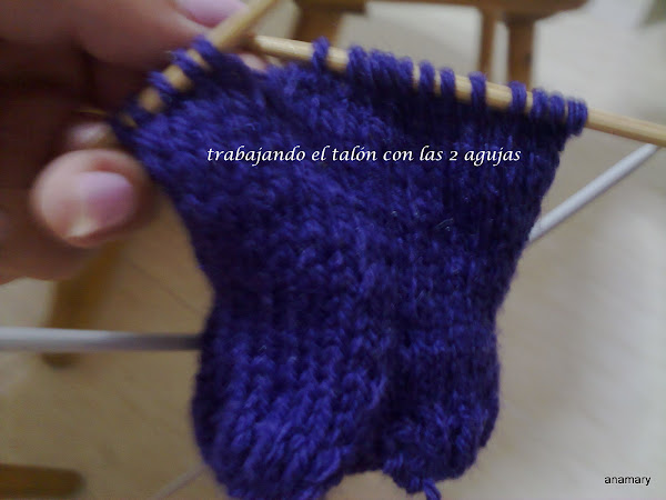 ,para hacer la forma del talón dividimos los puntos que tenemos en estas agujas entre 3 y trabajamos de la siguiente manera,por ejemplo si en las agujas tenemos 18 puntos,los dividimos entre 3 y nos quedan 6-6-6entonces trabajamos 5 puntos 2 juntos 4puntos 2 juntos y giramos la labor sin llegar al final,vamos trabajando siempre los 2 puntos juntos a cada lado de los 4 centrales y girando sin llegar al final de la vuelta hasta tener solamente los 6 puntos centrales.