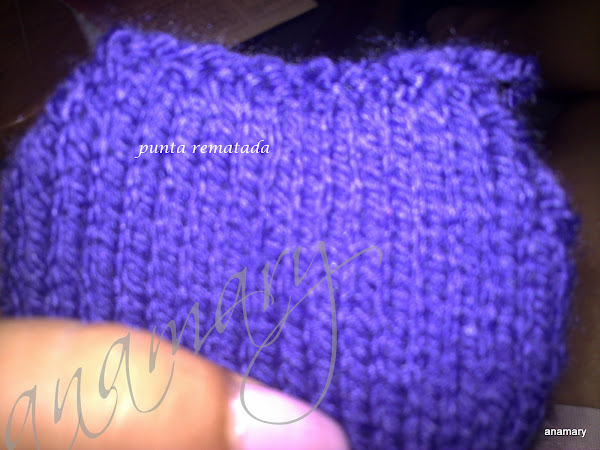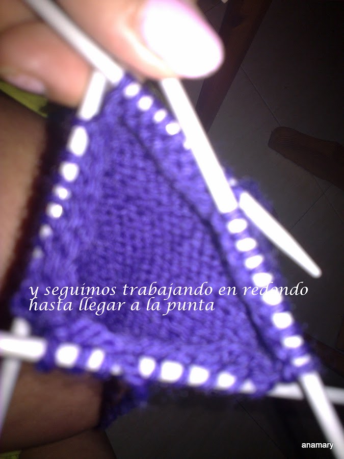 y seguimos trabajando en redondo hasta llegar a la punta,para los menguados tejer el antepenultimo y el penultimo punto de la 1º y 3º aguja juntos del derecho,y el 2º y 3º puntos de la 2º y 4º aguja ,vamos menguando hasta obtener la mitad de los puntos que podemos rematarlos a punto de malla o fruncirlos con el hilo de la labor