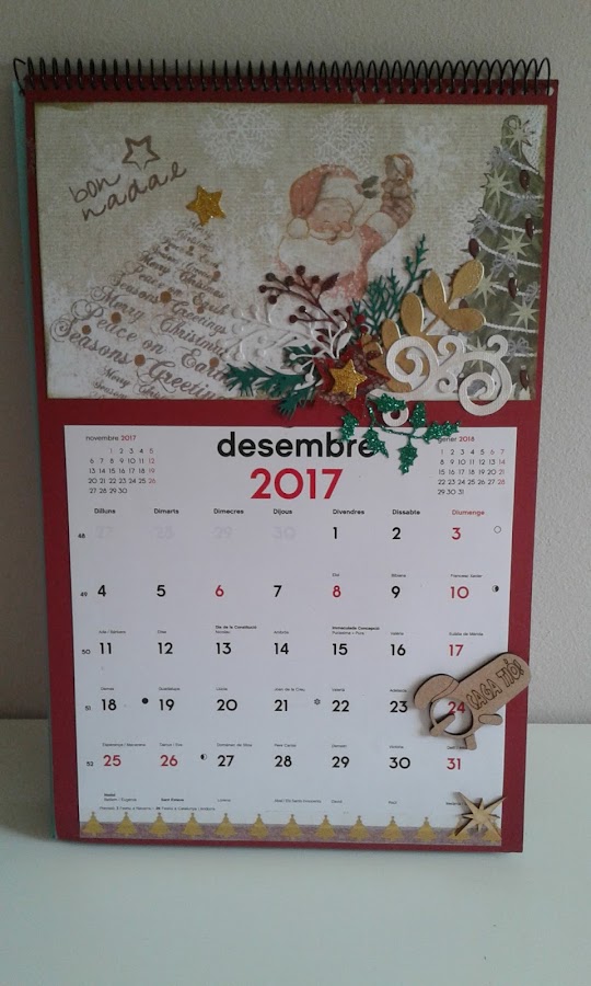 Sobre una base de cartolina de mida A4 hi he posat el calendari ( el vaig fotocopiar dun de compra), i a la part de dalt hi he posat la decoració que més lligava amb el mes . Si lany vinent en torno a fer un altre el faré de mida més petita, ja que el trobo una mica gran. Bé es tenia que provar i el proper any ja anirem arreglant el que aquest vegi que no funciona.