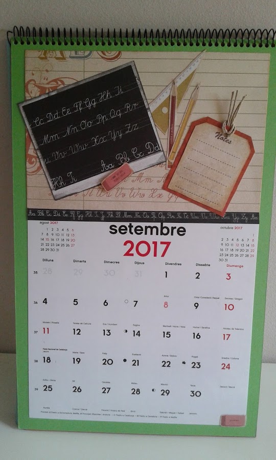 De tant en tant va bé fer neteja i ordenar papers i altres coses de scrap que es van acumulant sobre la taula , i ves per on de sota una pila de papers i altres i va sortir aquest calendari. Així que li vaig posar una espiral i a fer-lo servir que de moment ja sha perdut dos mesos.