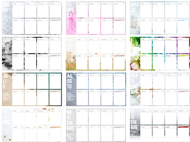 Se trata de un planner perpetuo semanal en formato horizontal A-4 (para imprimirlo, ajustar tamaño de impresión -en mi impresora es al 55%-) con frases motivadoras para cada mes ¡que buena faltan nos hacen!. De cada página tendréis que imprimir 4-5 páginas, en función del mes (pues todos los meses, excepto febrero, tienen 4 semanas y media).