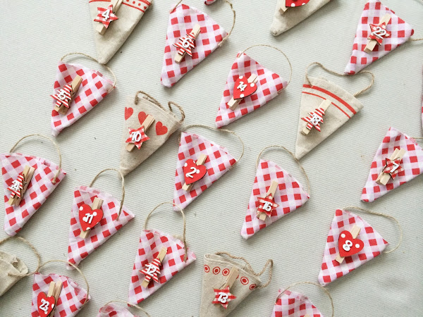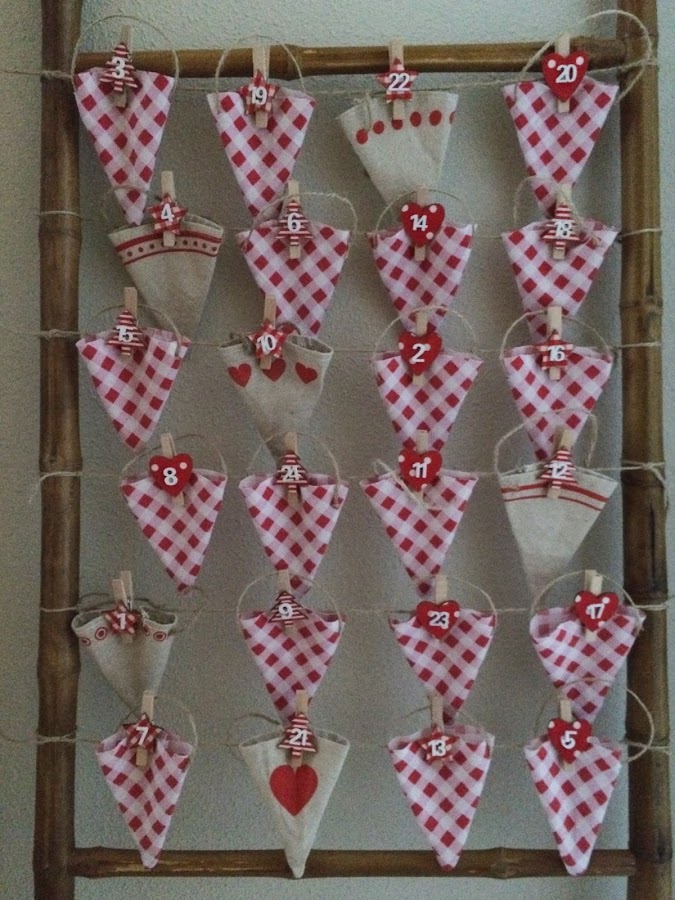 En principio las cestitas iban a ser para el árbol de navidad, pero al final decidí usarlas para el calendario y yo hice las 18 que me faltaban con una antigua tela de mantel que ya no usaba.