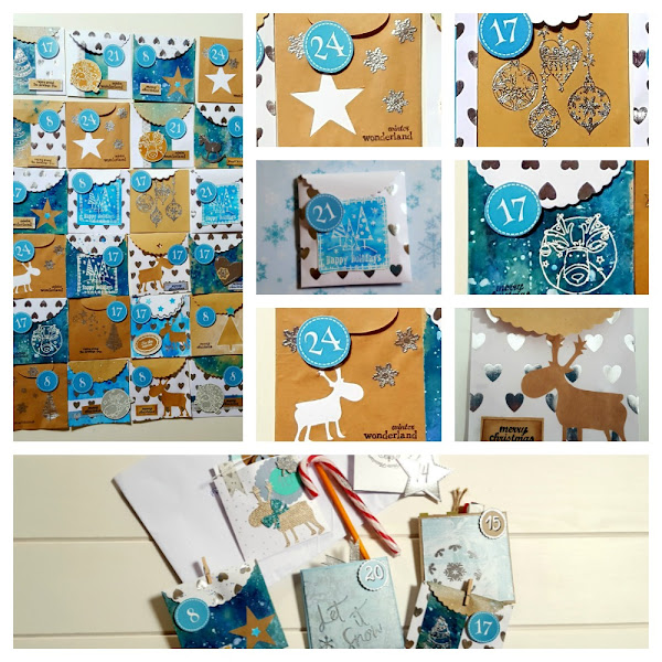 Otros sobres los he dejado en papel kraft y estampé sellos de Lili of the Velley con embossing plata (estoy enamorada de este polvo. También es de Izink y lo conseguí en la feria Creativa). Como puedes ver la decoración es sencilla: sellos, embossing, acuarelas, un mensajito navideño y el número correspondiente.