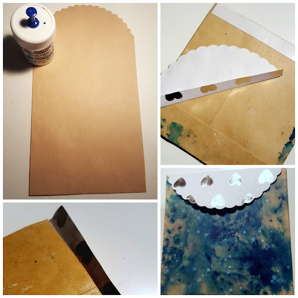 Espero que se entienda la idea anterior con la foto. Antes de cortarlos he decorado los sobres con acuarelas azul, turquesa y blanca.