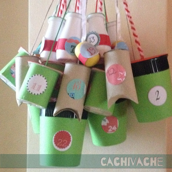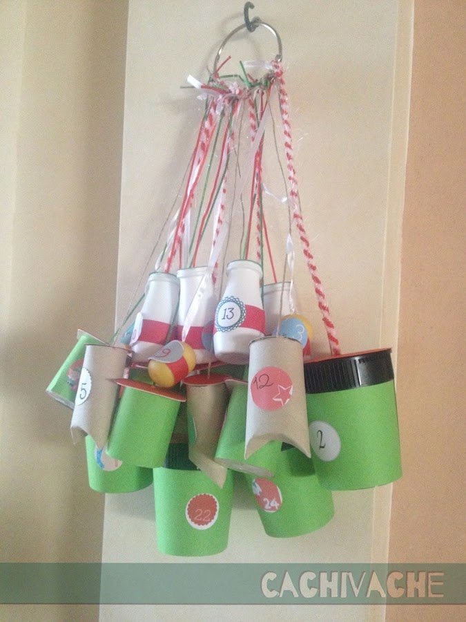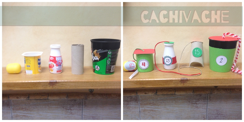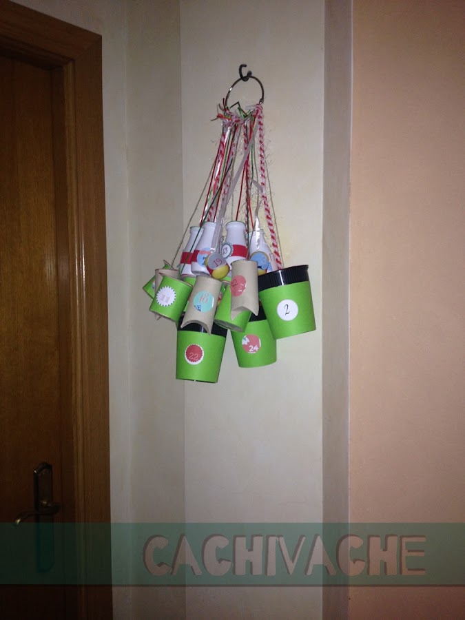 PROCESO:Después de recopilar varios recipientes (en mi caso: 5 vasos de yogurt, 5 botellitas de yogurt, 5 royos de cartón de papel de WC y 4 de sopa instantánea), los decoré con cartulinas en rojo y verde, para unificar el conjunto. Coloqué la golosina dentro de cada envase y tapé con otra cartulina a la que le había hecho un agujero y atado un cordón, ( en cada envase uno diferente). Recorté unos números y los pegué a los envases y por último los uní todos a una anilla para poderlo colgar.