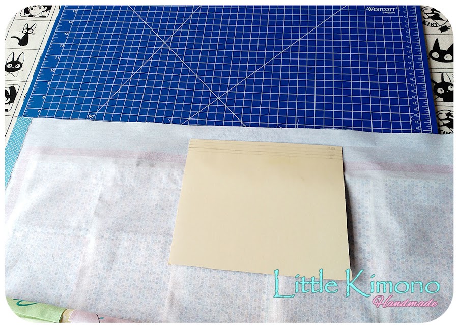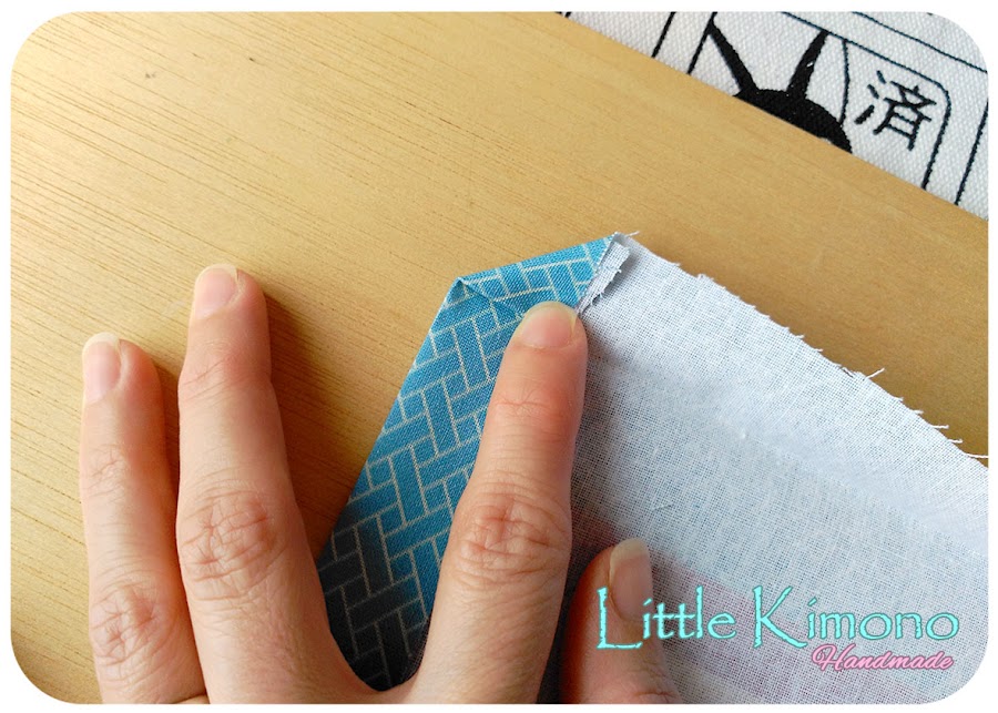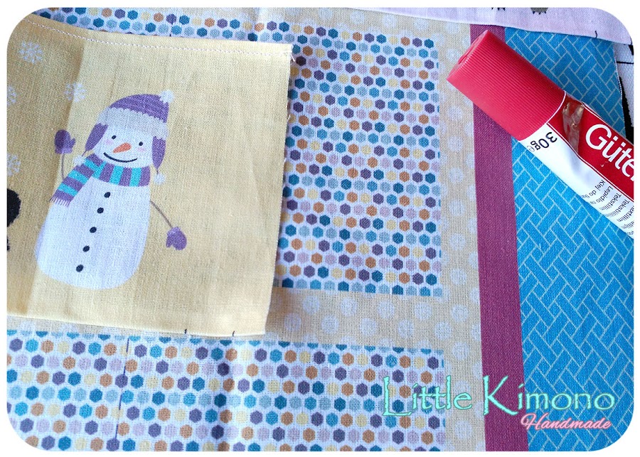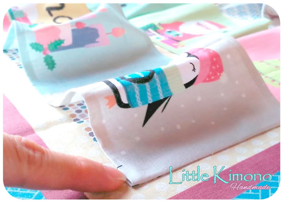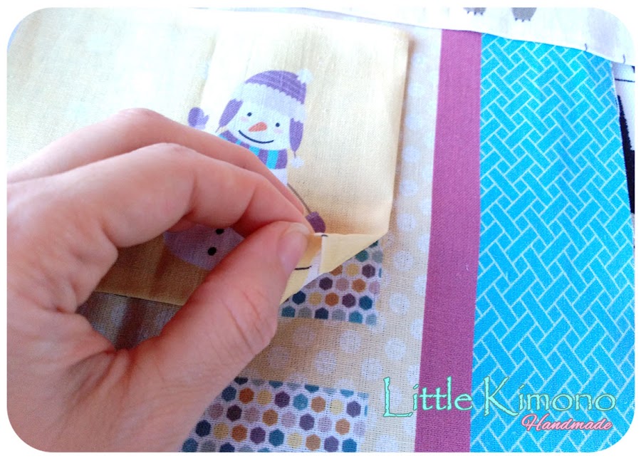 6. Doblamos y pegamos o cosemos las esquinas inferiores de cada cuadro ayudándonos de las guías que vienen marcadas en la tela (en el video de arriba podéis verlo con más detalle ;))