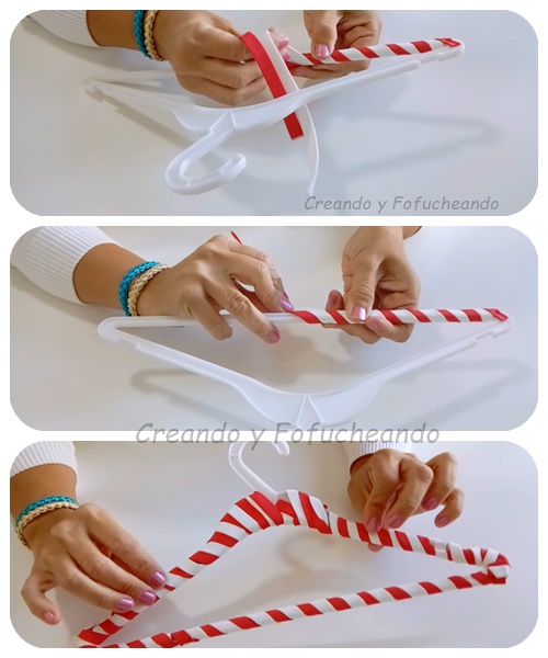 Para ello recorté tiras de Goma eva en colores blanco y rojo,y las fui entrelazando por toda la percha.
