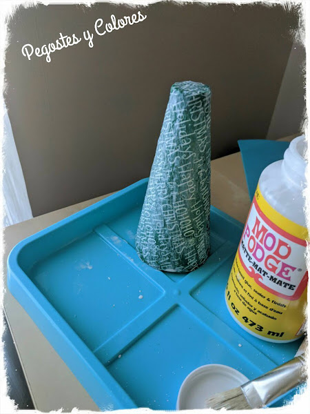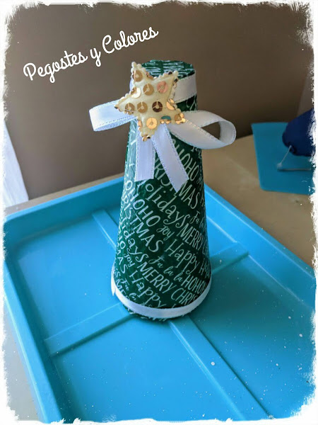 4.- El segundo pino solo lo forre pegando el papel de seda con una capa fina de pegamento blanco y luego protegi barnizando con mod podge. Adorne con cintas blancas y un adorno de forma de estrella.