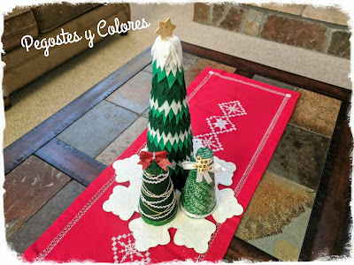 5.- El tercer pino lo forre con estambre y decore con cintas diversas, en la cima puse unos moños. No se aprecia en la foto pero son dos uno de cada lado.