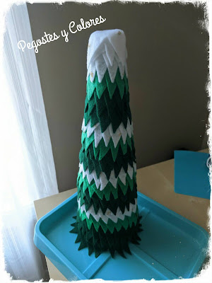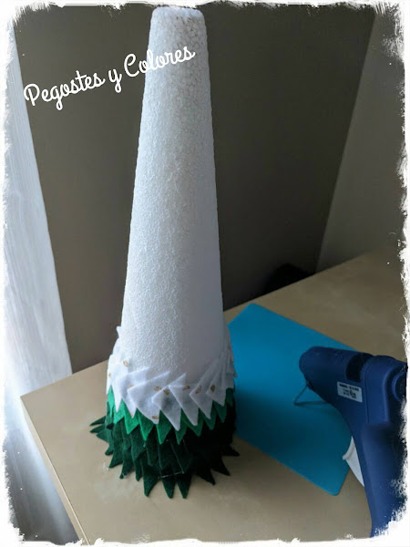 2.- Con la pistola de silicona fui pegando niveles de triángulos, dos de verde oscuro, luego verde y enseguida blanco, repetir hasta llenar y terminar con blanco.