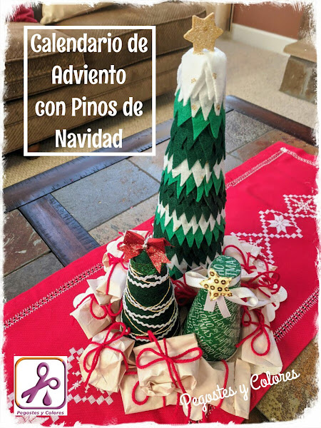 Pense que ya no me iba a dar tiempo, pero en el ultimo momento he podido hacer este sencillo calendario de adviento.Solo son 3 conos de porexpan, forrados y adornados en diferentes estilos y los he puesto sobre un marco de madera de forma de copo de nieve. Alrededor de los pinos puedes ver los diferentes paquetes con sus números y las sorpresas que he puesto para mi hija.