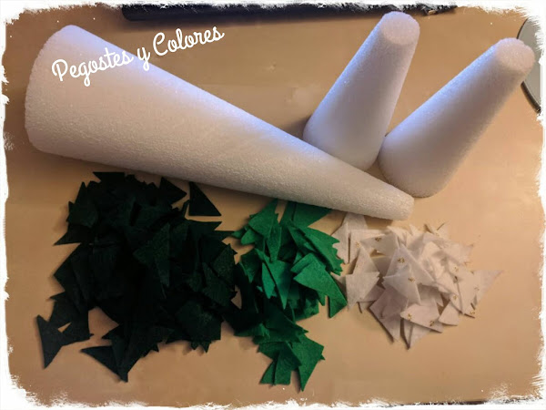 1.- Para el pino mas grande corte tiras de 3 cm de ancho y de ahi fue cortando triángulos en fieltro verde oscuro, verde y blanco.