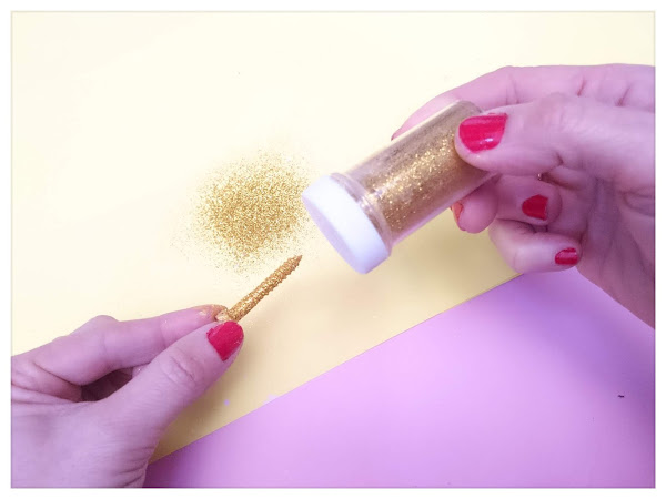 Y antes de que se seque la pintura, rociamos los tornillos con la purpurina o brillantina, como