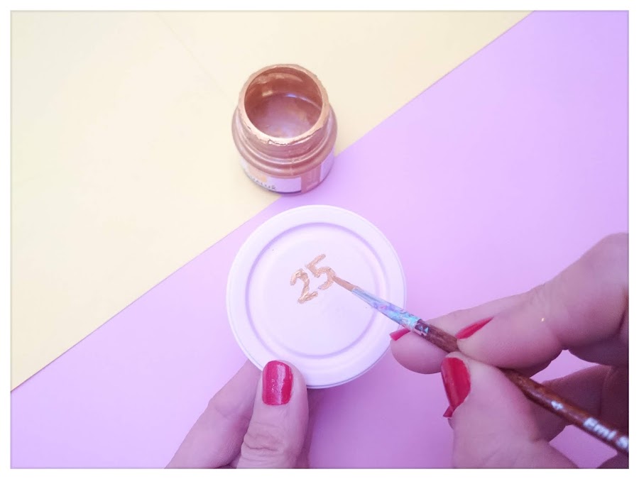 Con un pincel fino de punta dura, pintar los números en las tapas de las latas, yo hice este