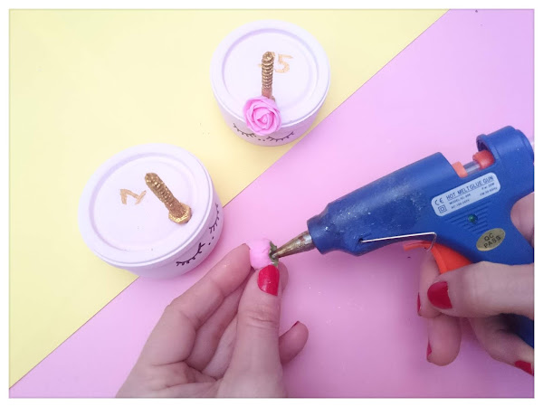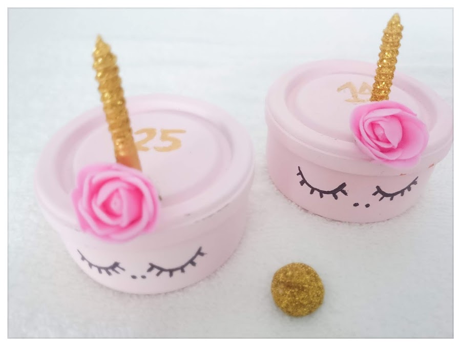 El siguiente paso será pegar el tornillo dorado a modo del cuerno del unicornio, a la tapa de