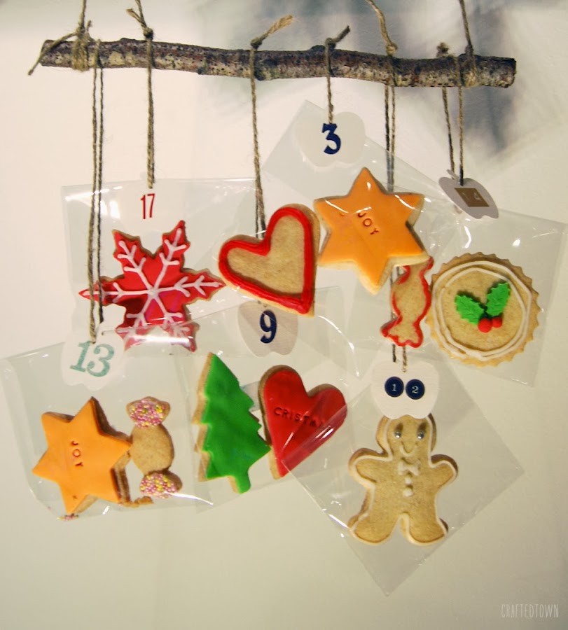 El calendario esta hecho de galletas de mantequilla decoradas. Durante mis años de cocinitas, he probado diferentes recetas para hacer galletas de mantequilla, pero mi favorita hasta el momento es la deliciosa receta del libro "La receta de la felicidad", uno de mis favoritos. Si tenéis que hacer un regalo a alguien especial que le gusta cocinar, seguro que le encantará este libro. Para hacer las galletas lo único que necesitáis es la masa de las galletas (hecha con vuestra receta preferida), cortadores de galletas con motivo navideños, icing y fondant en colores que representen la Navidad. Entonces tan solo necesitáis dejar volar vuestra imaginación y hacer vuestras mejores galletas. ¿Qué os parecen mis galletas? ¿Os gustan?