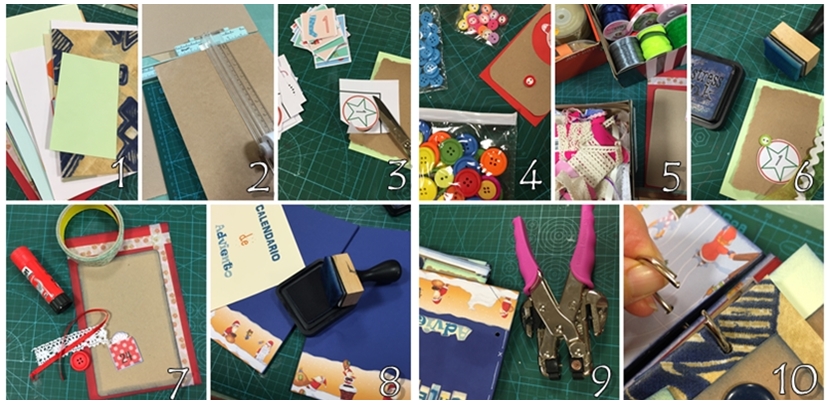 Para unificar el calendario he usado varios elementos que se repiten y que aunque cada uno es diferente a otro tiene un nexo de unión en conjunto. Estos elementos son: 1. los sobres ( cada uno diferente a otro en medidas, colores, formas y materiales) 2. Papel crafs (Presente en todos los sobres para su decoración) 3. Botones ( Diferentes para cada combinación del sobre) 4. Cintas y Puntillas (Diferentes para cada combinación del sobre). 5. Tinta en color azul (Para unificar el calendario).