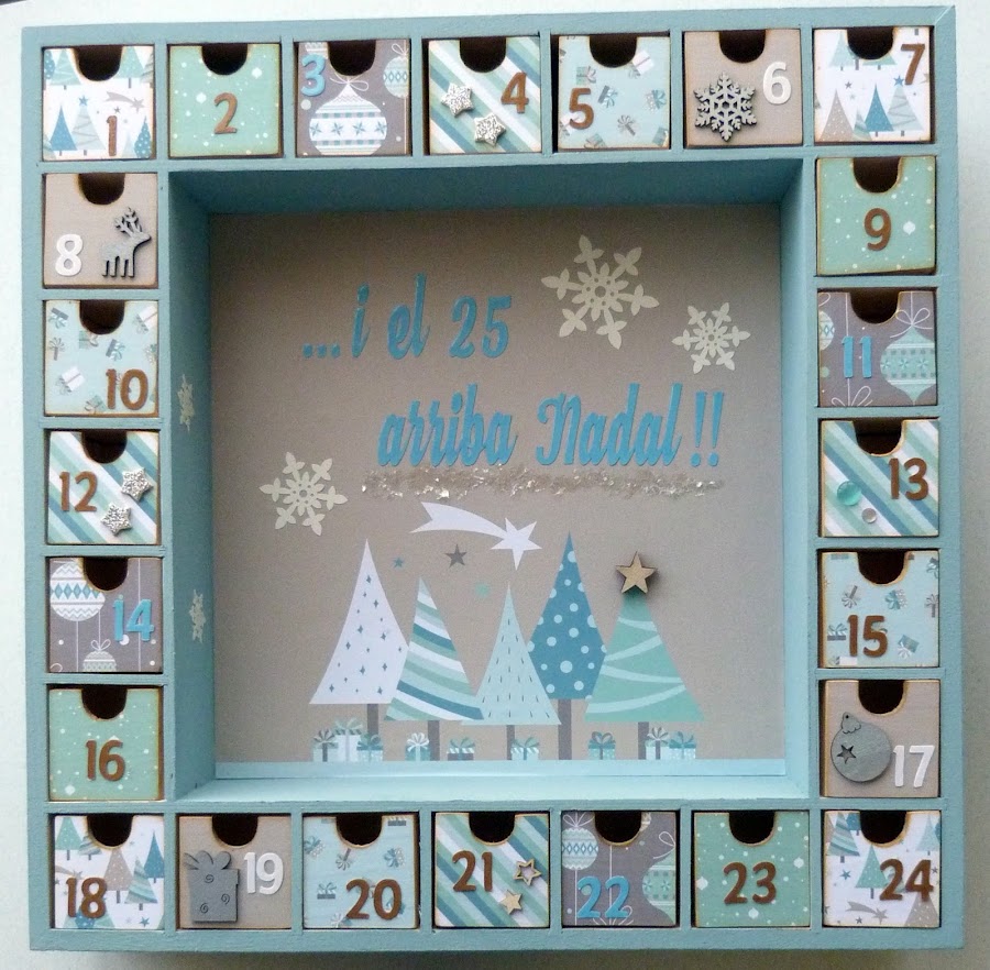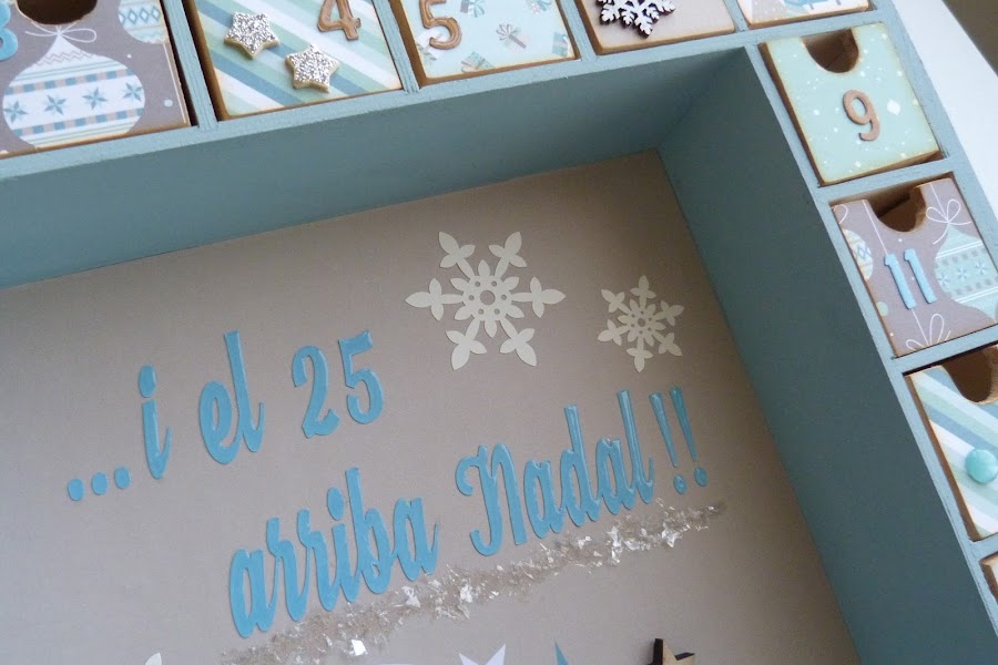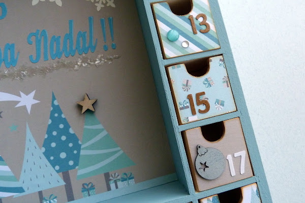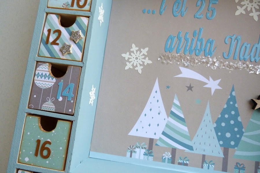 En algunos cajones les he puesto un detallito, una maderitas con motivos navideños, unas estrellas con stickles plateados, unos cristales a tono...
