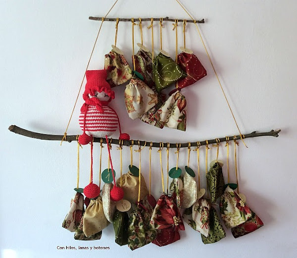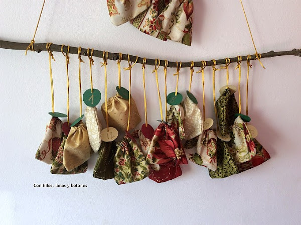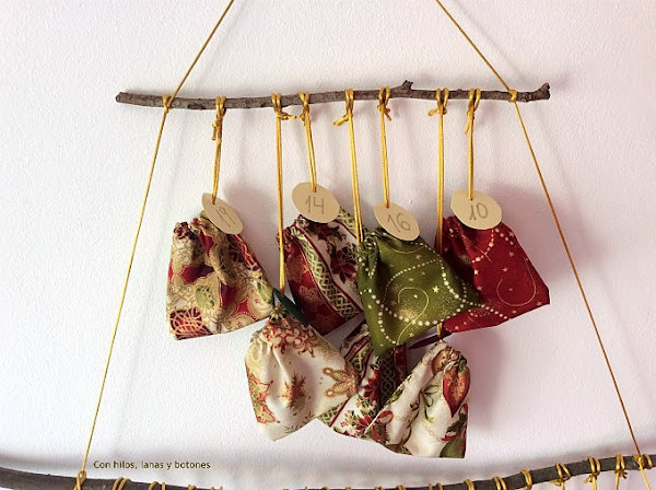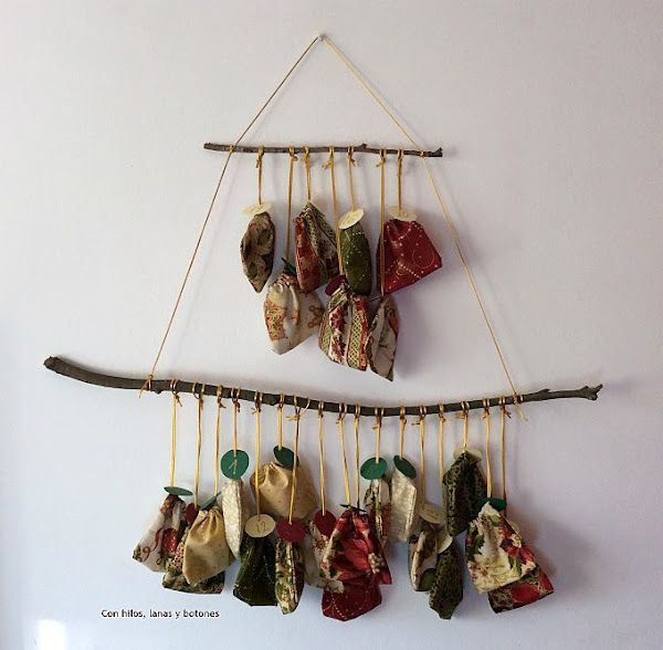Este calendario de Adviento es un proyecto sencillo apto para principiantes. Sólo tenemos que hacer 24 bolsitas de tela y colgarlas de unos palos. Bueno, o de una percha, o del propio árbol de Navidad si lo ponéis antes del primero de diciembre. Estas bolsitas dan mucho juego.