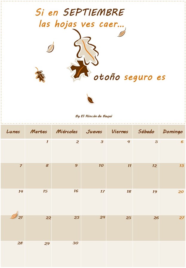 Con colores marrones y con muchas hojas otoñales se ha hecho el calendario para este mes de Septiembre, y con una frase muy de refranero "Si en Septiembre las hojas ves caer, otoño seguro es".