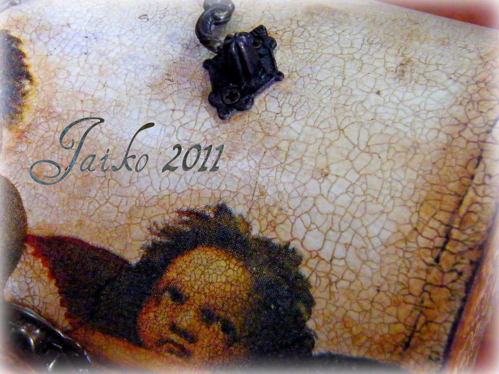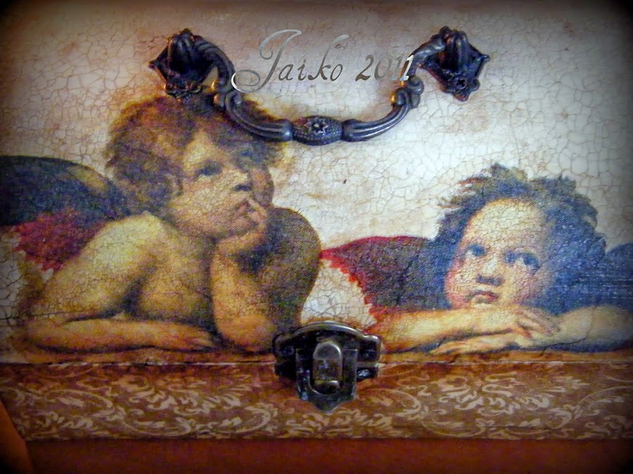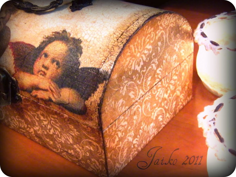 Me ha venido de lujo para empezar, no es muy grande y no me he complicado al hacerla, los pasos de siempre; imprimación, lijado suave, pintura color chocolate en las zonas que despues dacaparemos, cera de vela para enmascararlo, dos manos de pintura color mantequilla, lijado sobre toda la superficie insistiendo en las zonas que antes dimos la cera para que salga el color oscuro, pegar los motivos de la servilleta que antes habremos recortado rasgando con los deditos y a jugar con el craquelado.
