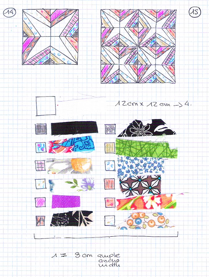 With this we have finished the block (14) and we get the kaleidoscopic effect when unite, at least four blocks (15). We leave measurements and samples of fabrics, but you know that you can improvise, we only suggest.