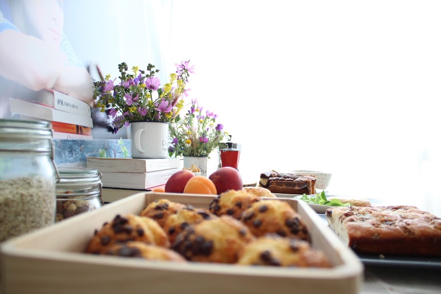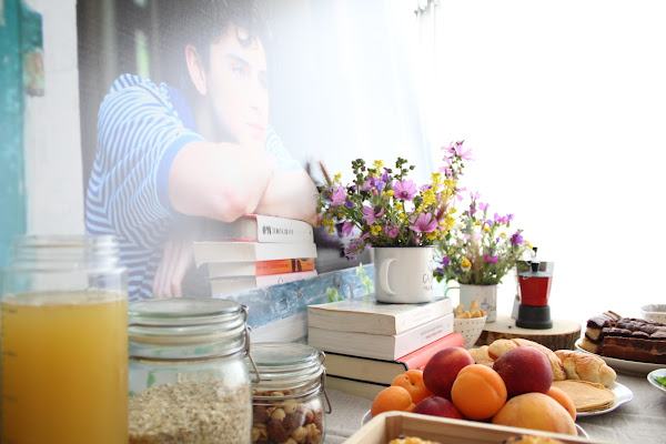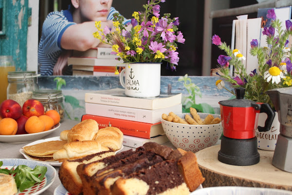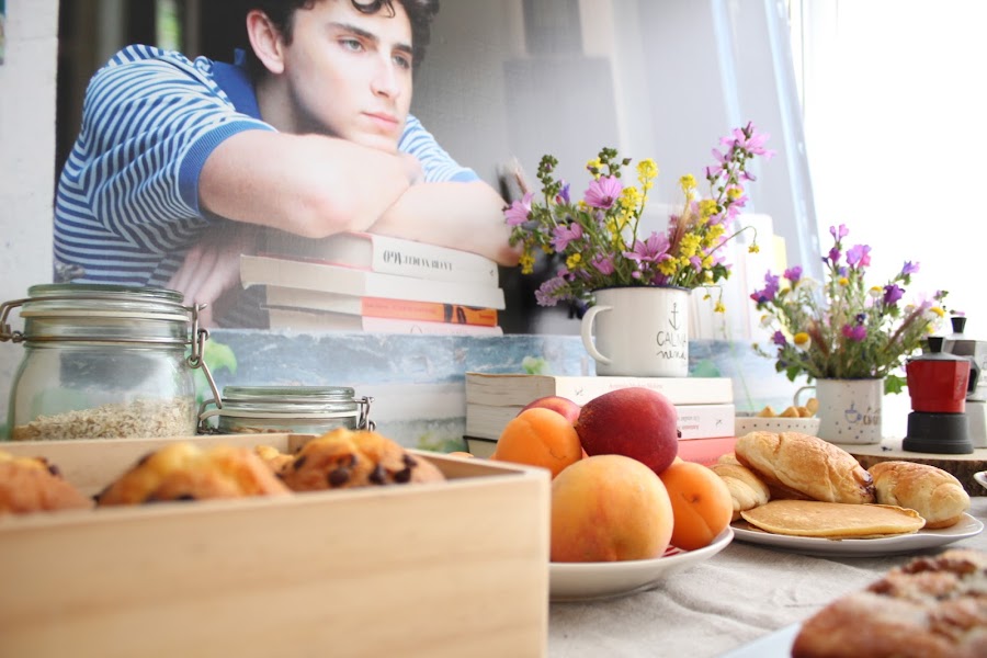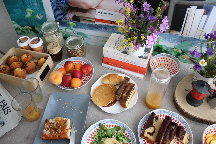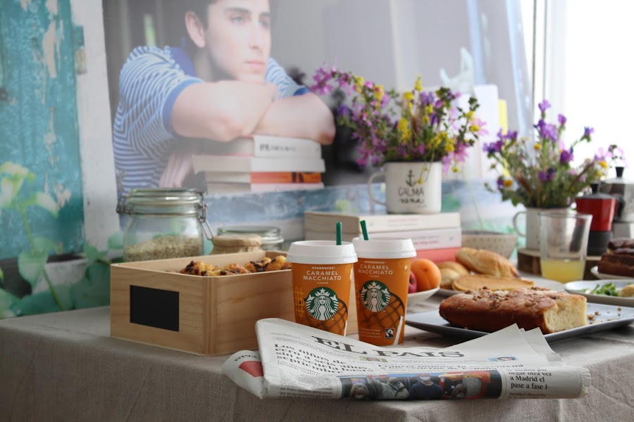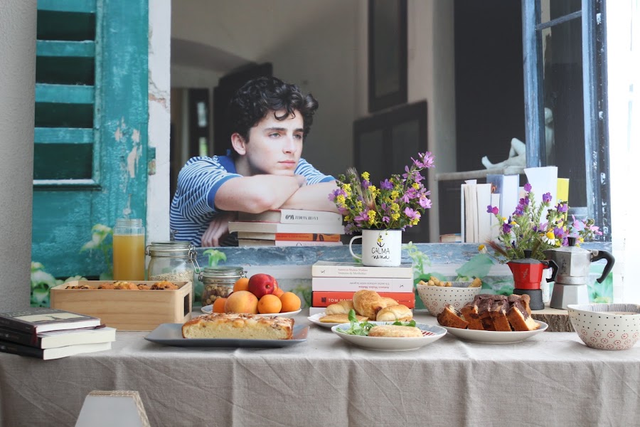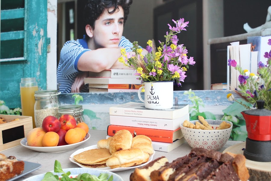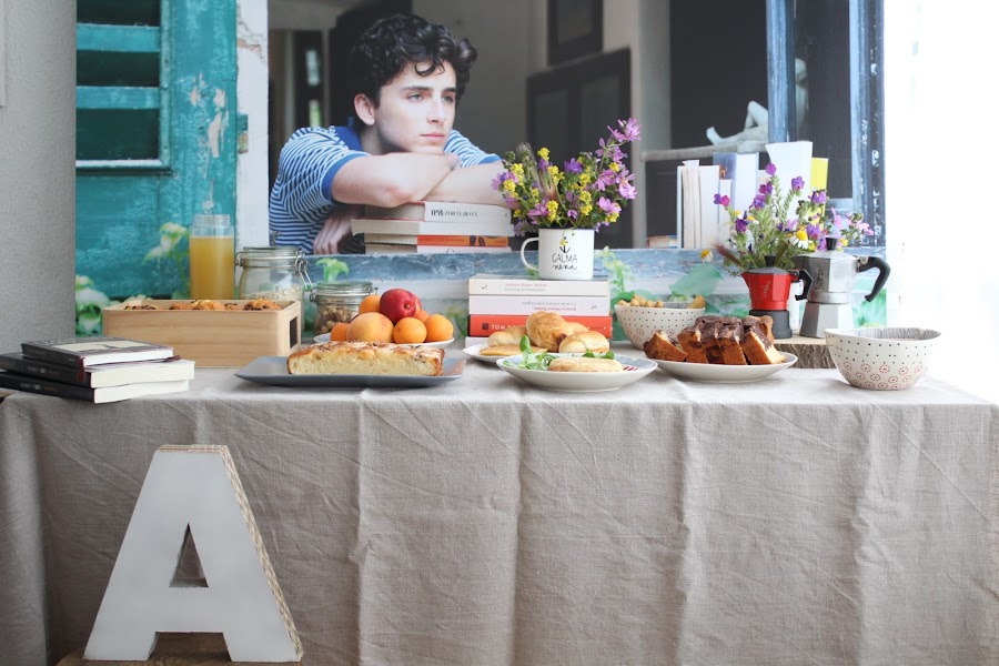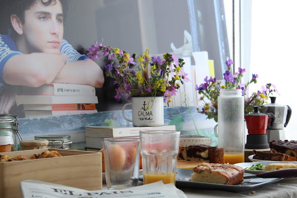 Revisionando la película empecé a fijarme en la importancia de esas mesas de desayunos de verano donde cada uno se va incorporando poco a poco y quisimos reproducir algo similar. La idea era hacer un pequeño brunch (yo siempre, siempre quiero hacer brunchs) que estuviese disponible a lo largo del día, con fruta, zumos, yogures, cereales, café, algo salado... lectura, periódicos. Un día tranquilo, sin prisa como pueden ser los días ociosos de verano y como si duda son los días festivos en cuarentena.