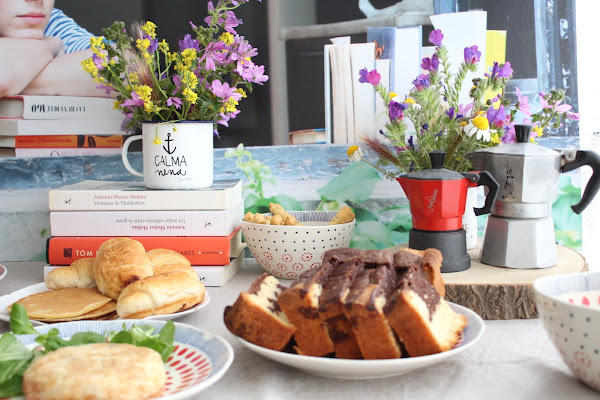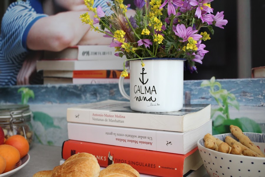 La fotografía de fondo lo hace todo, a veces nos complicamos con mil complementos pero todo lo demás son cosas que ya están siempre en casa y las flores las cogimos en la calle (los jardineros municipales no habían pasado a desbrozar y toda la acera estaba llena de flores silvestres). Unos libros para continuar con la idea de la foto, las cafeteras italianas, mezcla de vajillas... Los cantarillos donde van las flores son una de mis debilidades y hay siempre varios por casa, uno de hecho es reciclado de este cumple ¿os acordáis?.