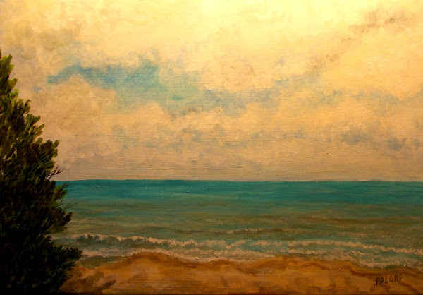 ..acrilico sobre lienzo 35x50 cm texto de Arub Aisha Muy feliz y sorprendida me ha dejado esta obra, de la artista Maria Luisa Palomo, las nubes se estan abriendo, ahora nos dejan ver un pedacito de cielo de un azul muy claro y limpio, pronto el sol volverá, la tormenta terminó, el mar ya se encuentra en calma, el agua vuelve poco a poco a color natural, el oleaje esta tranquilo y levanta poca arena y solamente en la orilla, la playa se ve tranquila, el talento y la destreza y la gran creatividad de Maria Luisa Paloma, nos queda manifestado en cada obra que trae, los detalles son sorprendentes, con los colores exactos, no sobra ni falta nada, todo es maravilloso, como el árbol de la entrada, del color de la esperanza, que nos da la bienvenida a esta magnífica obra, como siempre nuestra artista, sólo firma lo terminado, y para mi esta obra contiene un muy alto grado de excelencia y perfección.