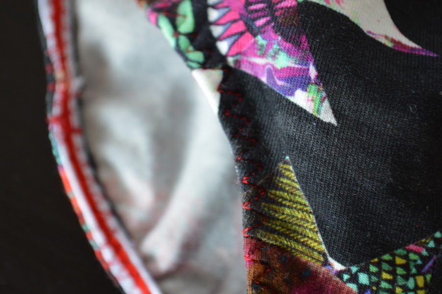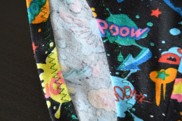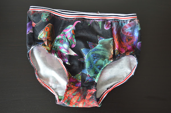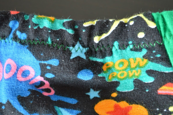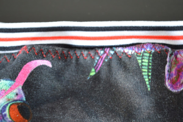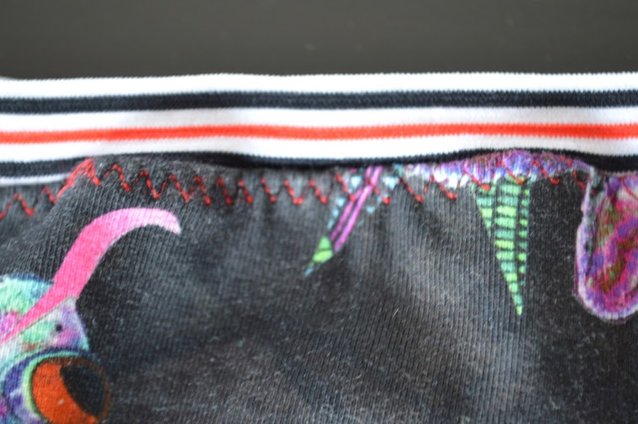 La versión 1 de camaleones está cosida con elástico en cintura y en perneras, la goma de la cinturilla está cosida derecho con derecho y remalladora, vuelta del derecho y pespunte zig-zag. Todo las costuras con overlock excepto el zigzag, en plan agonía para acabar rápido. La goma de las piernas estiré bastante, pero no le molestan.