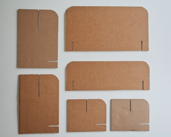 1. En la caja de cartón, cortas unos trozos como los que se muestran en la imagen con sus respectivas muescas.