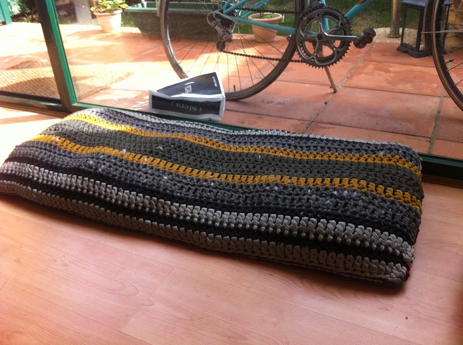 Al hacerse mayor, la cama que le habíamos comprado le quedó pequeña y, cómo no, decidí hacerle una "by hand made". Para ello, sólo necesité las "sobras" de los ovillos de trapillo que tenía por ahí y el relleno de algunos cojines viejos (como por ejemplo esos de Ikea, de 1,99â?¬).