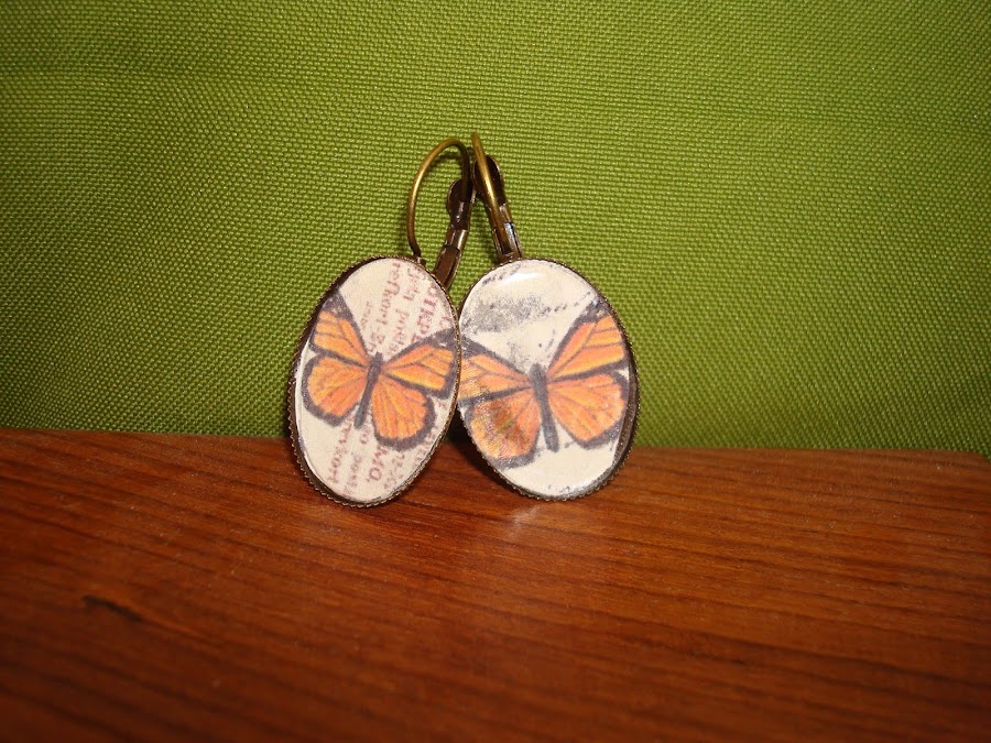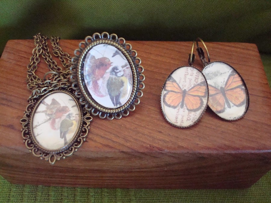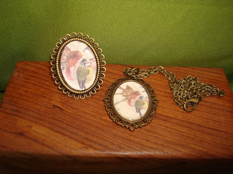 En este caso los pendientes llevan motivos de mariposas y el anillo y camafeo motivos de pájaros.