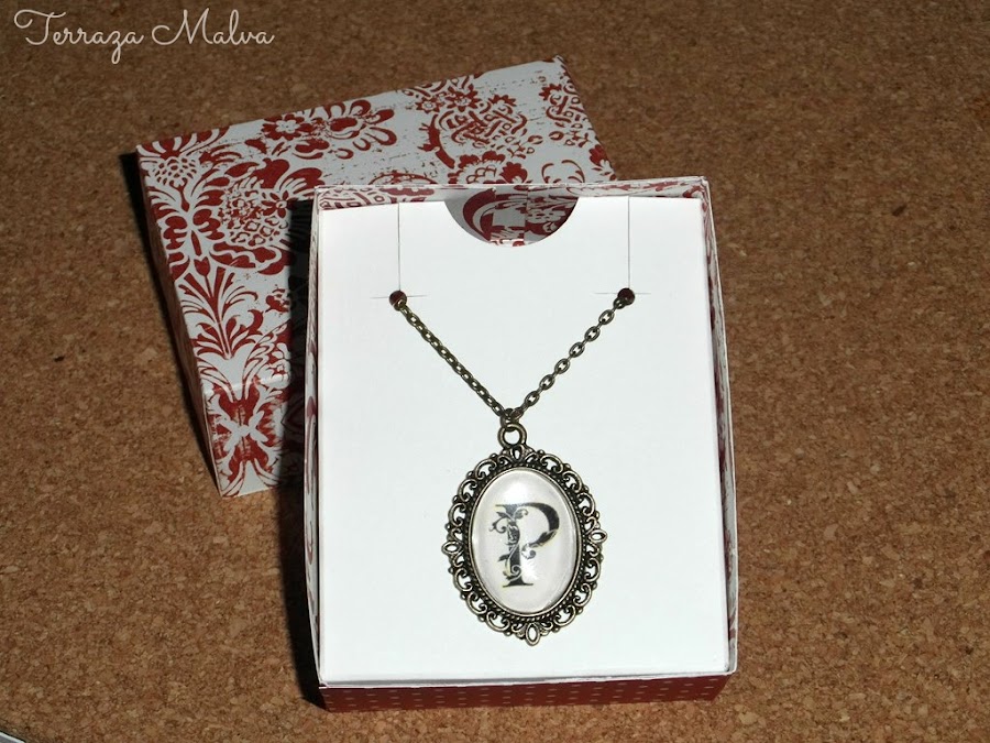 Para entregarlo he hecho una cajita con mi Scoring Board utilizando una cartulina de scrapbooking también con un aire antiguo, perteneciente a la colección "Alegría" de Tim Holtz. Y para sujetar el camafeo dentro de la caja lleva una cartulina blanca a medida con dos ranuras para pasar la cadena del colgante.