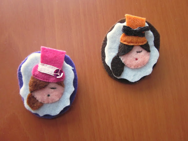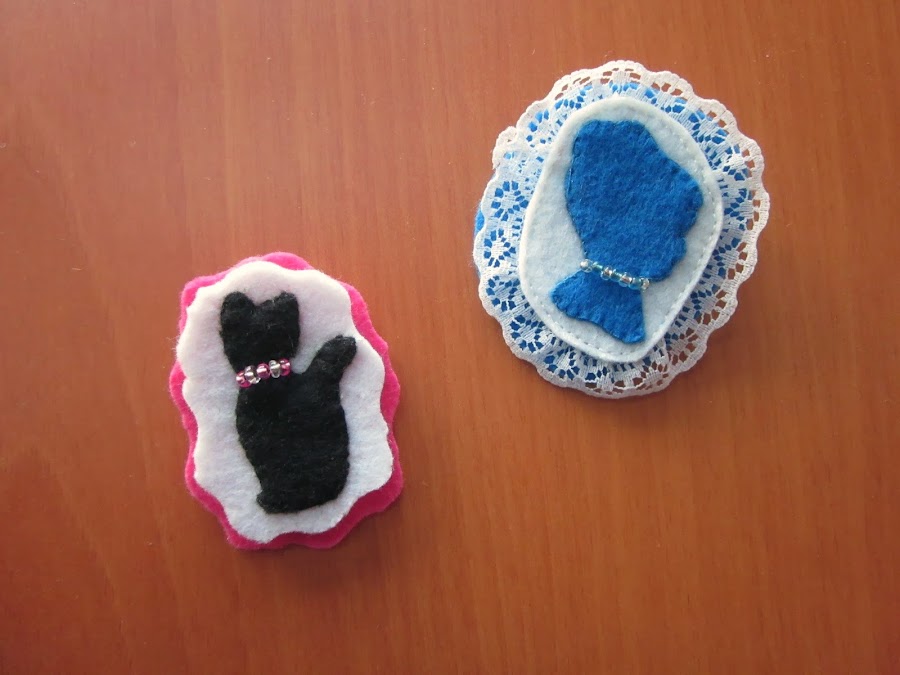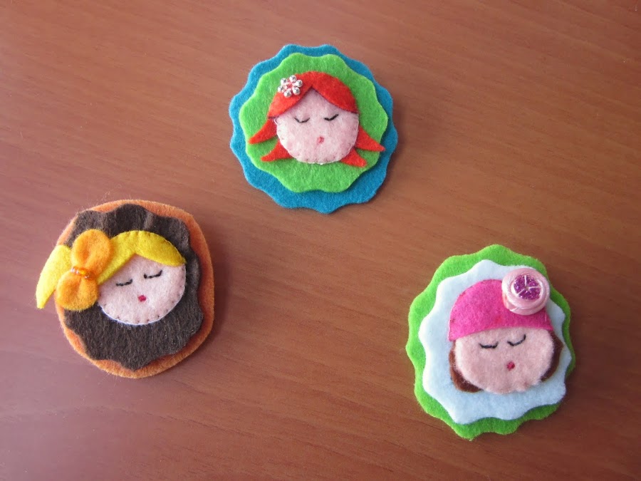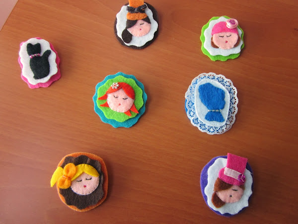 Simpáticos camafeos realizados con pasta de modelar, deocupage sobre ellos luego que ha secado muy bien y finalmente una generosa mano de barniz brillante para protegerlo y a su vez que tenga ese toque tan delicado. Como ven los materiales no son nada del otro mundo ni complicados . He usado fieltro y he pegado el medallón luego con silicona caliente y la decoración en la que usado restos de ca ...