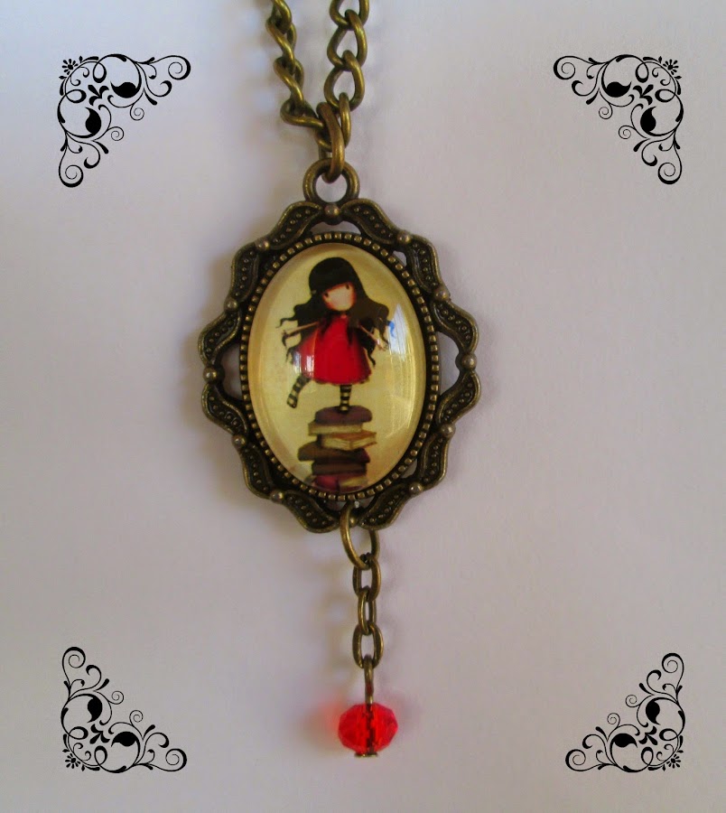 Este otro es uno de los que más me gustan, es una muñequita Gorjuss sobre un montón de libros, pienso que es ideal para amantes de la lectura, además le he añadido un colgante de una bolita de cristal en rojo que le queda muy bien.