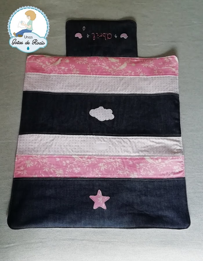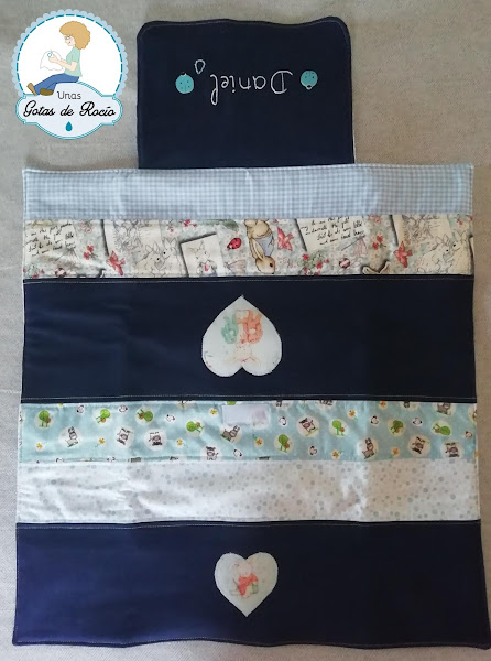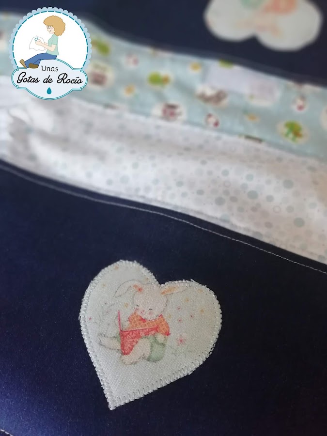 He combinado varias telas azules, y he aplicado con festón dos corazones de una tela preciosa en tonos suaves con estampado de conejitos.