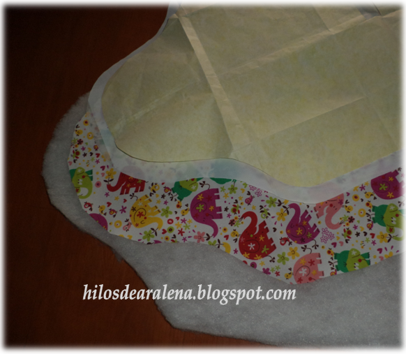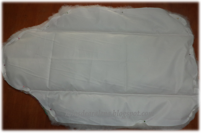 ....ponemos encima, la guata y la tela impermeable . Sujetamos con alfileres o hilvanamos para que no se muevan .