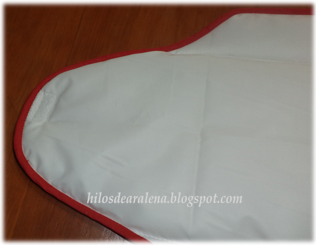 En la cara superior , donde pondremos al bebe a la hora de cambiarlo , he usado la tela que se usan en las camperas rompevientos ,en color blanco. En una de las caras viene engomada para que no pase el agua.