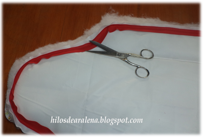 Ahora tenemos que coser el bies en todo el contorno . Cortamos el sobrante y emparejamos muy prolijamente.