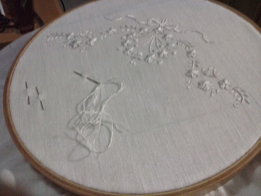 Ahora he vuelto a aparcar los calcetines (serán para dentro de unos añitos a este paso) y me he metido de lleno en este bordado, son unos cuadrantes que me pidieron para una boda. Aqui os paso la primera fase, el dibujo y la primera esquina acabada aún en el bastidor.